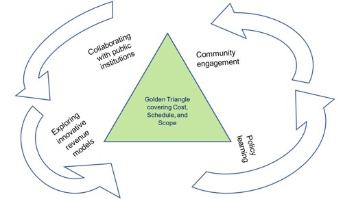 Building on the above discussion, project professionals must consider new ways to deal with external factors influencing the project outcome. In addition to the golden triangle, fundamental to project management practice, we need to focus more on evolving policy landscape, exploring new revenue streams, developing strategic partnerships, and engaging local communities to create new values that will help us deliver low carbon projects.