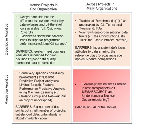 We used the answers to these questions to create a summary of where we are with project data analytics and, importantly, the barriers that are preventing its wider uptake. In analysing the results of our interviews, we identified that we needed to establish some succinct definitions in order to discuss results between ourselves and our interviewees.