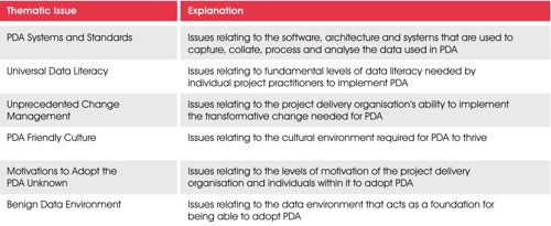 The Delphi participants response has shown a number of implications for adopting PDA. Firstly, the thematic issues are linked together in a network of complex relationships. These need to be managed carefully and there is no ‘silver bullet’: all aspects of implementing PDA need to be considered holistically and simultaneously. Secondly, organisations need to recognise that their journey to adopting PDA needs to reflect how mature they are across the thematic areas. Only by addressing all aspects of organisational implementation and by tailoring their journey will organisations be able to benefit from the huge potential that project data analytics offers.