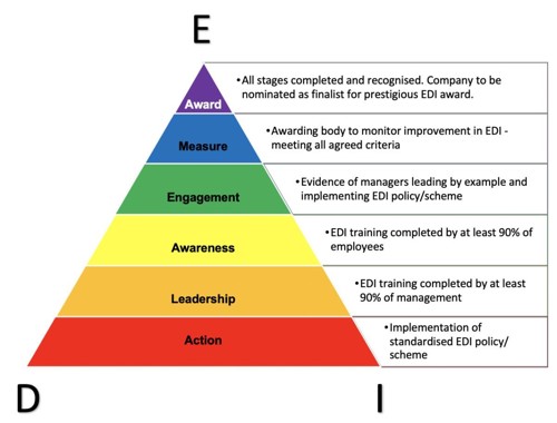 - Measure - Unannounced and announced visits from an EDI awarding body to monitor whether the policy/scheme is being implemented across the organisation. They can monitor improvements in EDI, and officially sign off completed stages.