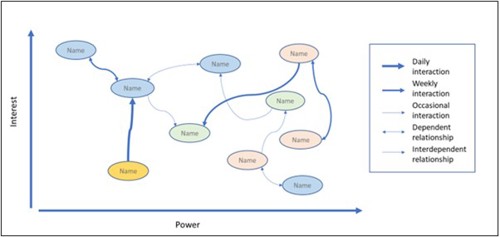 At some stage, you should start to see the interconnections and appreciate the bigger picture. Figure 3 is one approach to visualising the emerging situation. While it uses frequency of interactions to identify level of influence you can modified it to just to show strength of influence. It can also show who shares what information. If time allows this simple tool can be developed further and become a social network diagram.