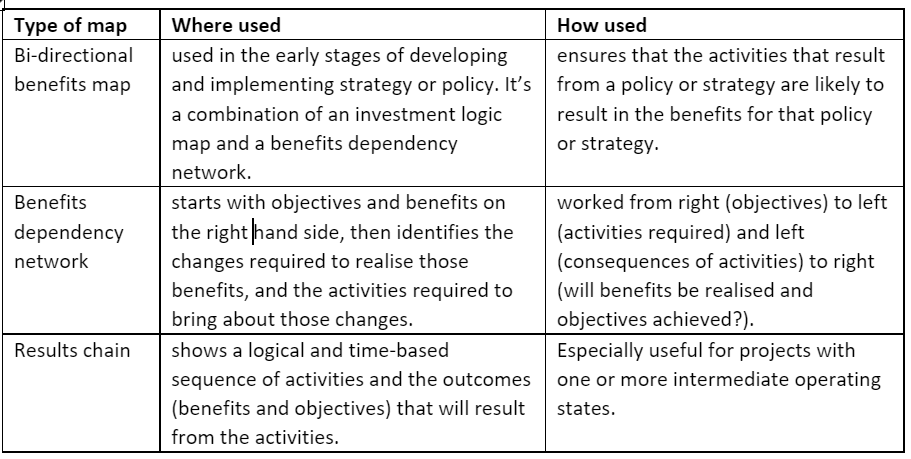 The British standard describes three types of benefits maps that are compliant. These are not the only benefits maps, but they are the ones that have been proven to work: