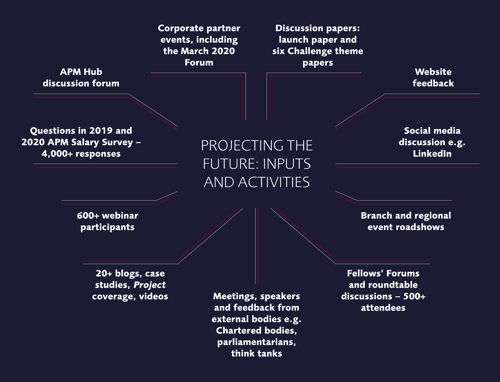 With 2,000 print copies distributed and more than 18,000 views online, the Challenge papers generated continued discussion across APM’s social media channels, as well as at numerous APM events, conferences and webinars throughout 2019-20. They also underpinned targeted stakeholder engagement, especially with organisations outside APM’s normal channels, reflecting the need to build the profession’s profile more broadly.