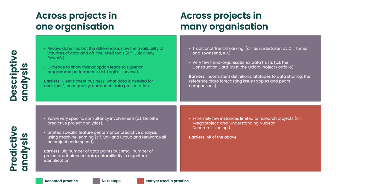 When considering the current adoption of project data analytics, it is useful to distinguish between: