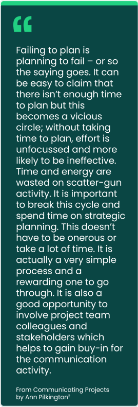 A strategy sets out the thinking that informs a project or programme’s communication. It can be thought of a bit like a business case in that it sets out the rationale for a particular approach, with a budget. It is a written description of a strategic planning process that has taken place. A communication strategy differs from a plan. A plan is a collection of tactics with timings that are designed to deliver the strategy. It may sit as an appendix to the strategy document. A plan that simply pulls together a number of tactics without a strategy behind them isn’t strategic and is really just a calendar.
