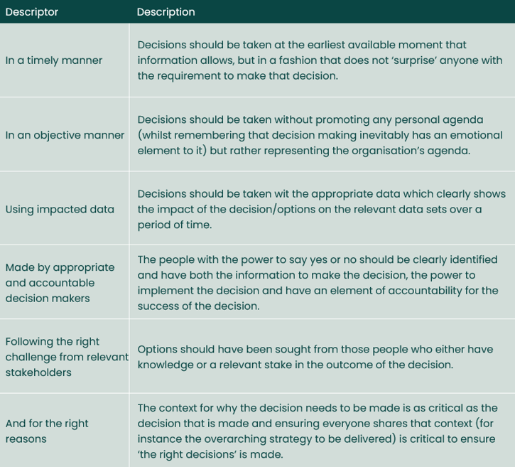 ‘A good decision is one taken in a timely and objective manner; using relevant data, made by appropriate and accountable decision makers and following the right challenge from relevant stakeholder for the right reasons.’ Many of the table would also add ‘underpinned by a strong recommendation from the portfolio director’. ‘There may be no right decision - but there's definitely a wrong decision!’ |