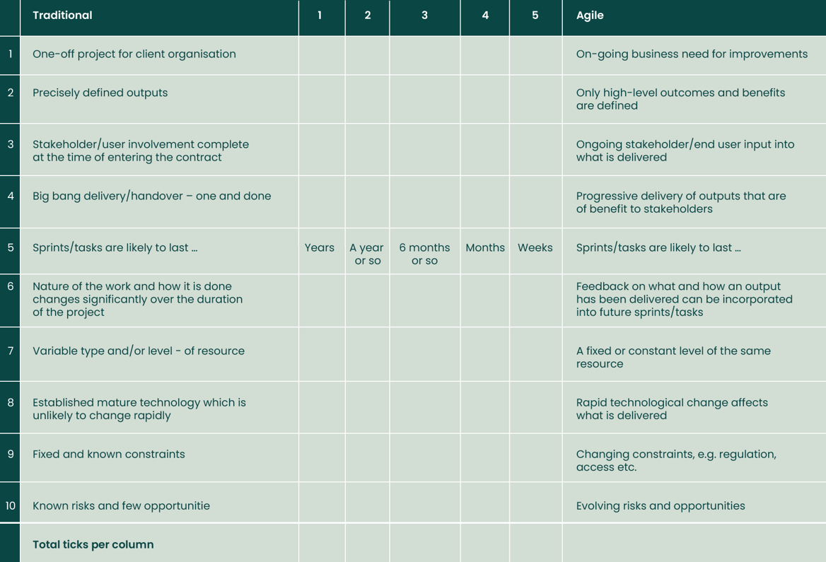 Below is a table to give an indication of where on the traditional/‘waterfall’ to agile spectrum a potential contract package falls. On each row, tick where you think your project or projects typically sit, then add up the ticks in each column. This should give an indication of where on the ‘waterfall’/agile spectrum your project or projects sit and hence the nature of the arrangements – not just with respect to contracts and procurements – used to manage the project, programme or portfolio.